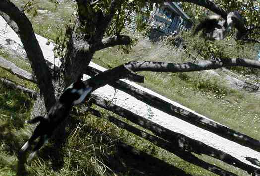 This was no problem and I got to within about 10 feet of it. Finally it flew over to an apple tree a little further away and Mr. Felix then noticed it again. He stalked up to the tree and I managed to get a picture of him in full flight leaping at the tree just as the heron began to take off from the branch.