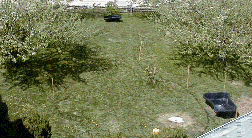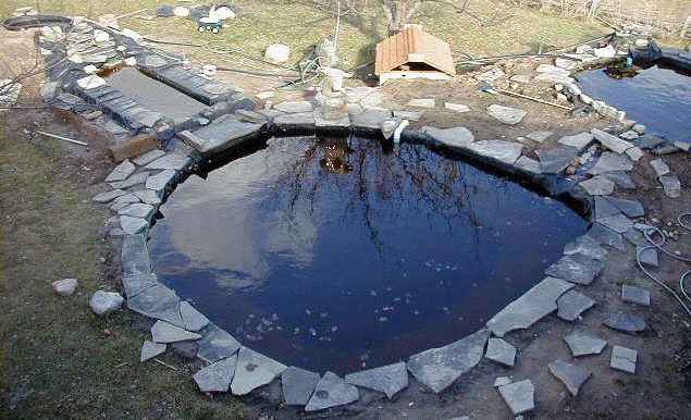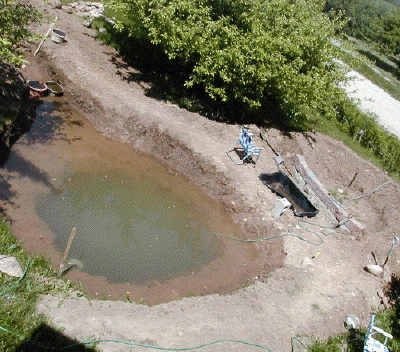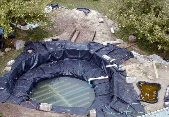 The picture below shows the installation of the first liner in the satellite pond and the temporary layout of the pipes for the under gravel filter in the main pond. This was September 1, 2001.