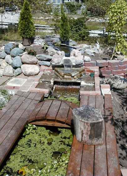 Next I concentrated on the waterfalls at the 'north' end and the decking beside the stream. The stream is actually about 20" deep and is a place for water hyacinths and other filtering plants, protected from fish. There is a surface dam that prevents surface water, along with the tiny floating pond plants from flowing directly over the falls. It's a piece of wood about 6" deep that lies across the top of the pond before the falls. An inch sticks out from the water and about 5" is below the surface.