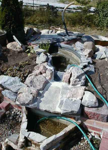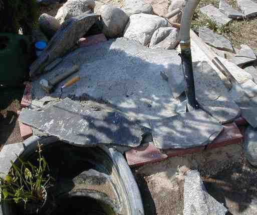 This shows the beginning construction of the upper north falls with the 1-1/2" delivery pipe from the pump coming through the poured concrete slab. The slab formed the base on which I mortared the rocks to create the falls.