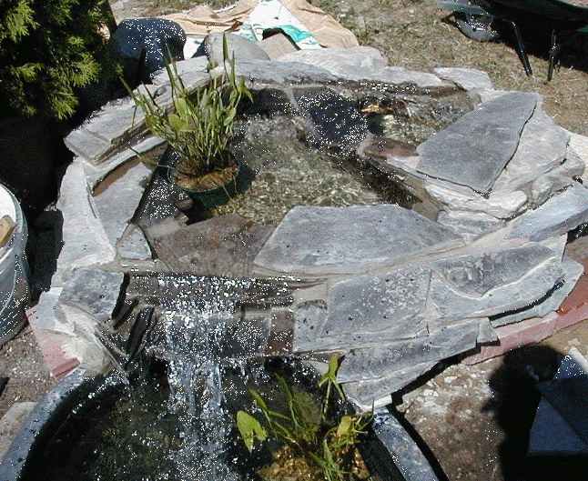 Below you can see the finished construction. The water is delivered to the small section, upper right, flows into the next section with the plant, then transitions into the plastic insert. I did some fine mortar work with small pieces of the flagstone to contain the water flow into the plastic insert. The flat surfaces get a small amount of splash and make good places to grow moss.