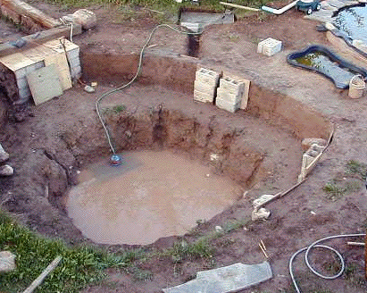 The picture, right, shows several sections of the pond's upper wall supported by concrete blocks with plywood squares behind them. The clay slurry was poured down behind the plywood to set up and produce a smooth vertical wall.